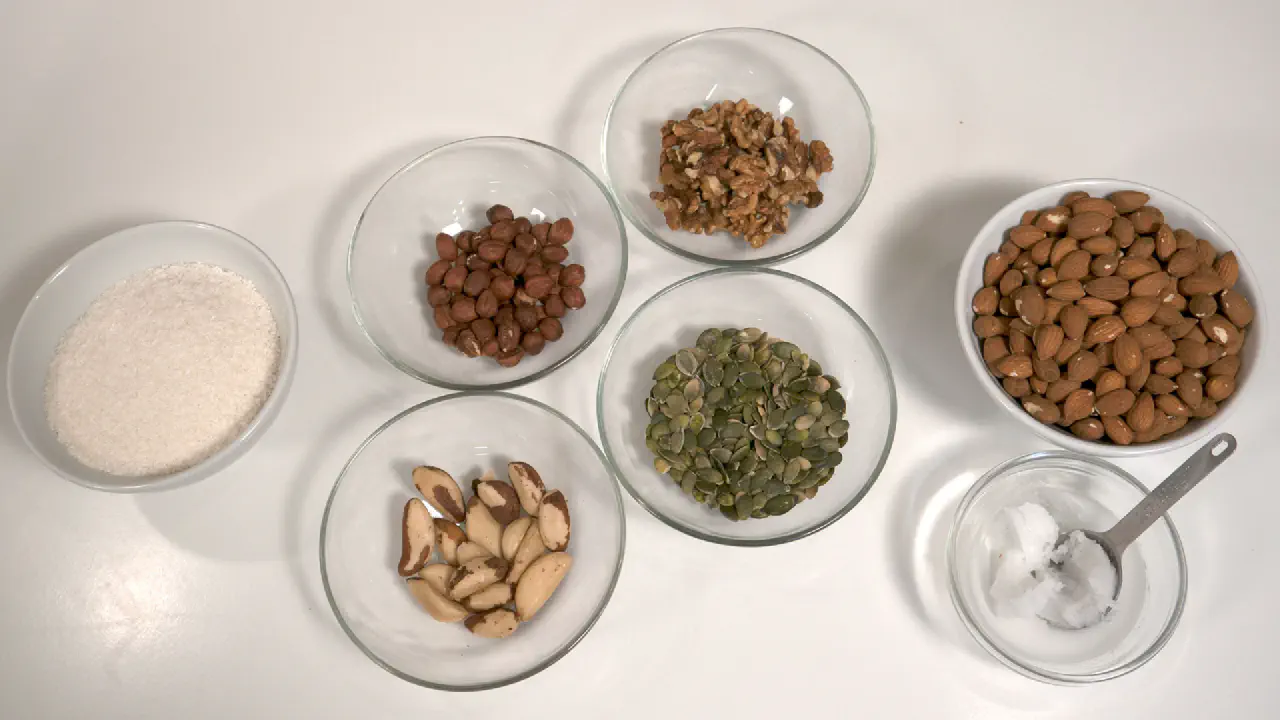 Nüslien er ret tilgivende med at tilsætte ekstra nødder og kerner. Så bare brug hvad du har, eller kan komme til at købe. Og så tilsæt 1 spsk kokosolie per 200 g ekstra nødder.