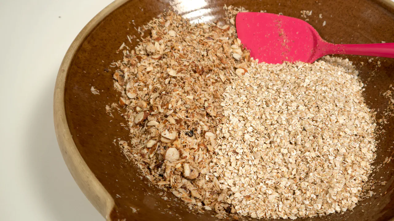 - 600 g havregryn. Tilsæt så 3 spsk ekstra kokosolie når det ristes af 2-3 gange.