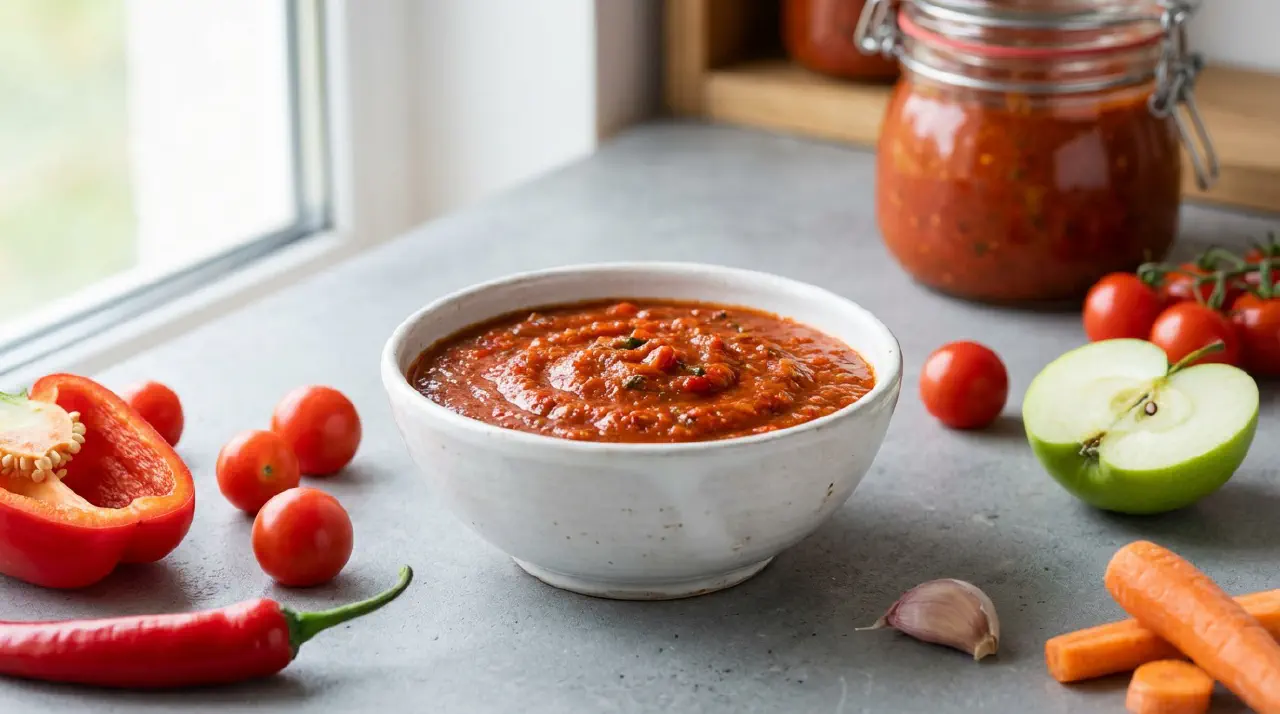 Adjika er en kogt tomat-og-grøntsagssauce fra Rusland, tilpasset fra den originale georgiske rå chilipasta. Den russiske version er et helt andet produkt – tomater er basen, med gulerødder, æbler og peberfrugter der tilføjer krop og naturlig sødme. Den simrer i ca. to timer til en tyk, smørbar sauce beregnet til konservering og langtidsopbevaring.