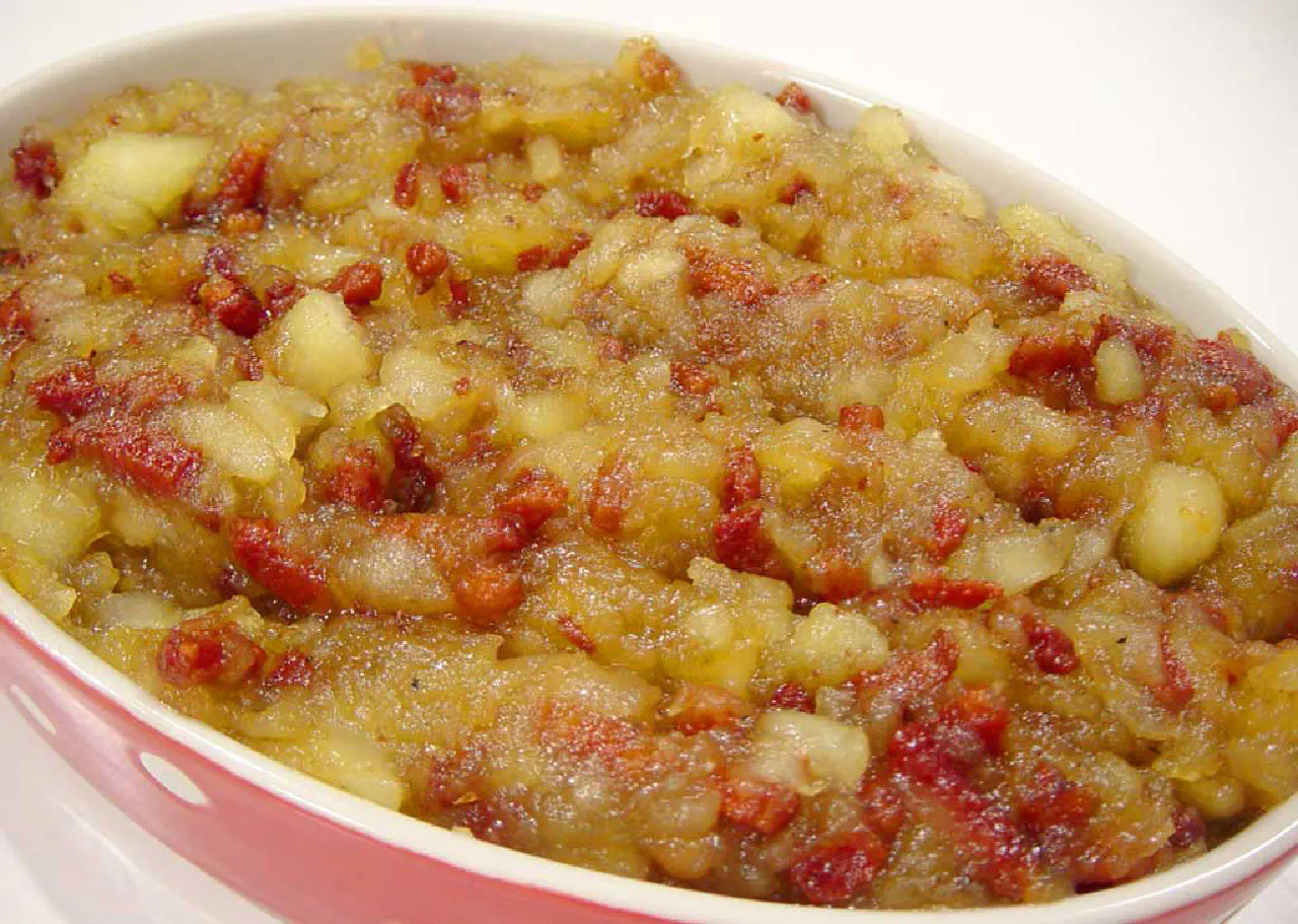 Retten er ikke særlig følsom over for mængden af ingredienser. Så den “løse” opskrift er “en pande fuld af æbler med skræl, bacon til at dække bunden af panden, og sukker til at dække æblerne.”