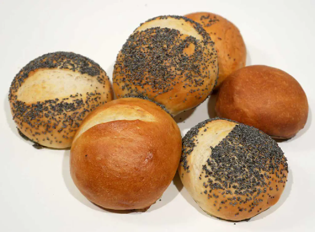 De små brød kan bages både 15-20 minutter ved 230 grader og 20-25 minutter ved 200 grader. Det kommer lidt an på hvor mørk du kan lide dit brød. Den højere temperatur giver brød der er mørkere på de højeste steder. Hvis du ikke pensler er det også bedre med den højere temperatur.