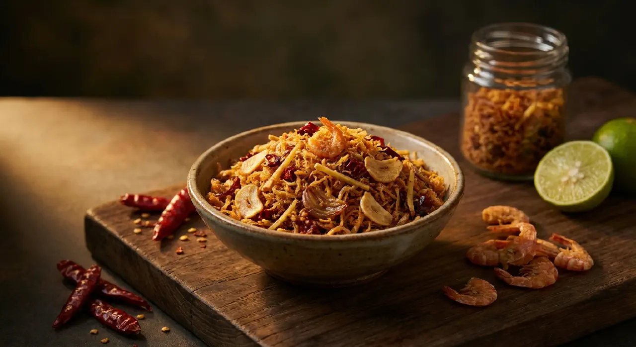 Et burmesisk sprødt stegt krydderi lavet af tørrede rejer, hvidløg, løg og chili. Hver komponent steges separat, indtil den er helt tør og sprød, og derefter blandes det hele sammen. Det holder sig i måneder ved stuetemperatur og er en fast del af burmesisk hjemmemadlavning – blandet i ris, drysset over nudler og grøntsager, eller spist som tilbehør til ethvert måltid.
