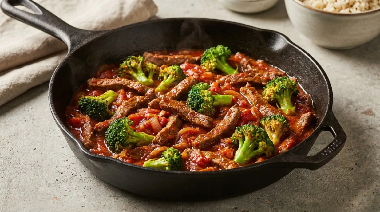 Her bruges oksekødsstrimler, der først brunes hårdt og derefter simrer møre i egen saft. Krydderierne — stødt koriander, garam masala, chili og sennepspulver — ristes kort med kødet, så smagen åbner sig. Tomater giver syrlig baggrund, og broccoli kommer i til sidst, så den holder sin bid.