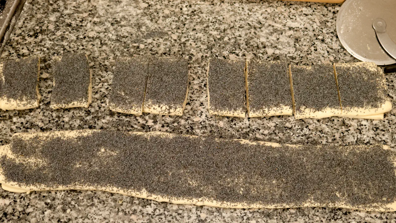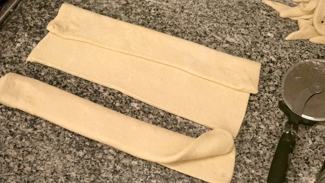 2 halve stykker wienerdej foldet i 3 lag til almindelige birkes. på den lange led. © kvalimad.dk