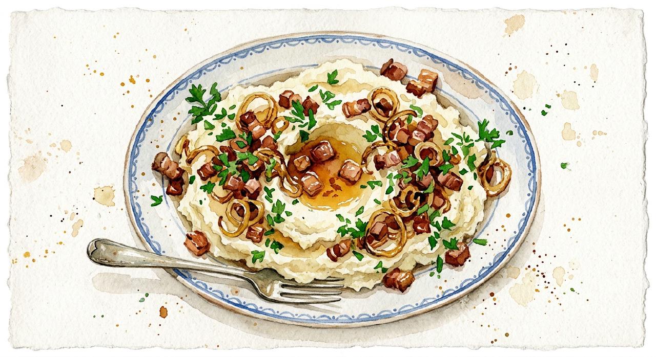 Brændende kærlighed er en af de mest elskede danske bondemadsretter: en bakke luftig kartoffelmos med sprødt stegt bacon og bløde, gyldne løg. Navnet siges at stamme fra det varme baconfedt, der hældes i en fordybning i mosen. Simpelt, mættende og godt.