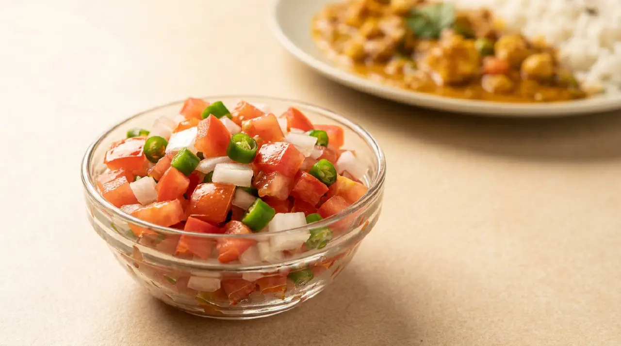 Cachumber er en rå indisk salat af hakkede tomater, løg og grøn chili med et stænk vineddike. Den fungerer som indisk salsa - frisk, skarp og lige syrlig nok til at skære gennem tunge curries og fedtet mad.