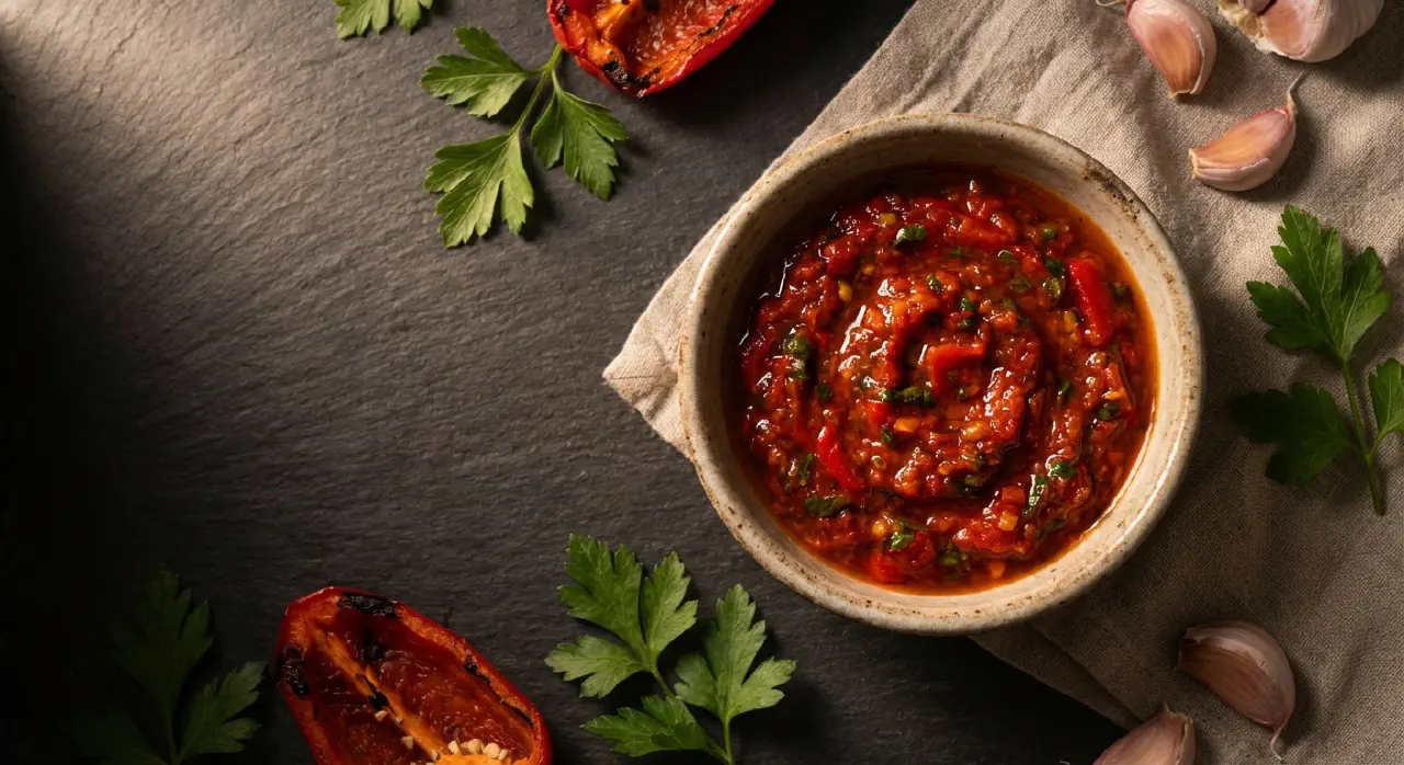 Chimichurri rojo er en moderne variant af argentinsk chimichurri, hvor ristede røde peberfrugter udgør basen. Traditionel chimichurri verde er persille, hvidløg, oregano, chilflager, rødvinseddike og olie - uden ristede peberfrugter. Rojo-varianten tilføjer røget sødme fra grillede peberfrugter og røget paprika. Den er populær i vestlig madlavning, men ikke noget man ville finde ved et traditionelt argentinsk asado. Brug den som tilbehør til grillet kød, ristede grøntsager, æg eller brød.