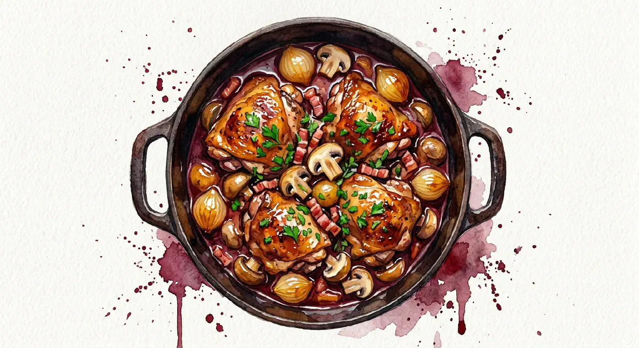Coq au vin er den franske klassiker, hvor en kylling braiseres langsomt i rødvin med bacon, skalotteløg og champignon. Retten stammer fra det franske landkøkken, men har længe haft en fast plads i det danske repertoire. Den kræver tålmodighed, men resultatet er mørt, saftigt kød i en dyb, rig rødvinssovs.