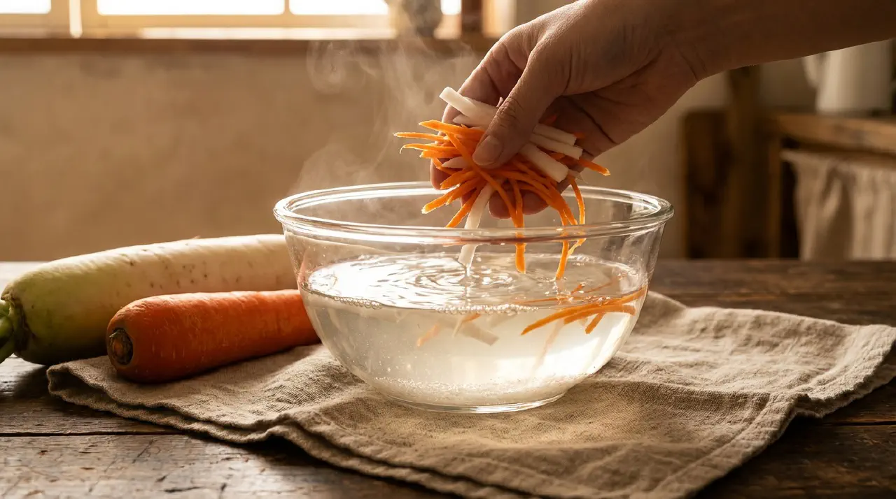En hurtigsyltningsvæske, der bruges i vietnamesisk madlavning til at give grøntsager en skarp, syrlig bid på bare ét minut. Det er ikke en sauce, du serverer alene - det er et forberedelsestrin. Dyp skivede grøntsager i dette bad kort, drån dem, og de er klar til at tilføje sprødhed og syrlighed til salater, banh mi eller nuddelskåle.