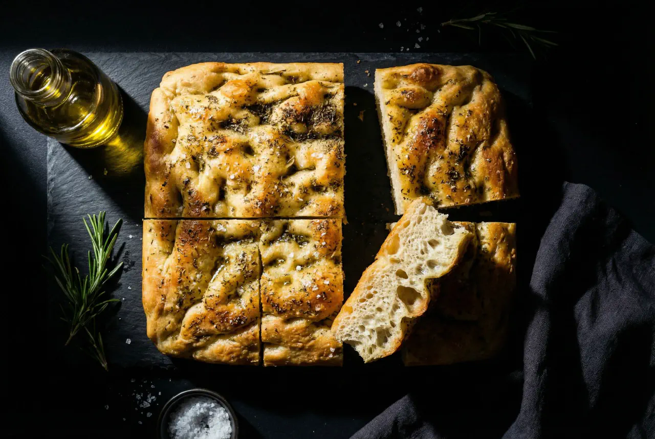 Et rustikt fladbrød med store, åbne, gennemsigtige huller og en tyk, dimpled skorpe rig på olivenolie og urter. Lang gæring — enten med forfermenteret dej eller kold hævning — giver den karakteristiske bikagestruktur i krummen. Mere mættende end pizza, lettere end sandwichbrød.