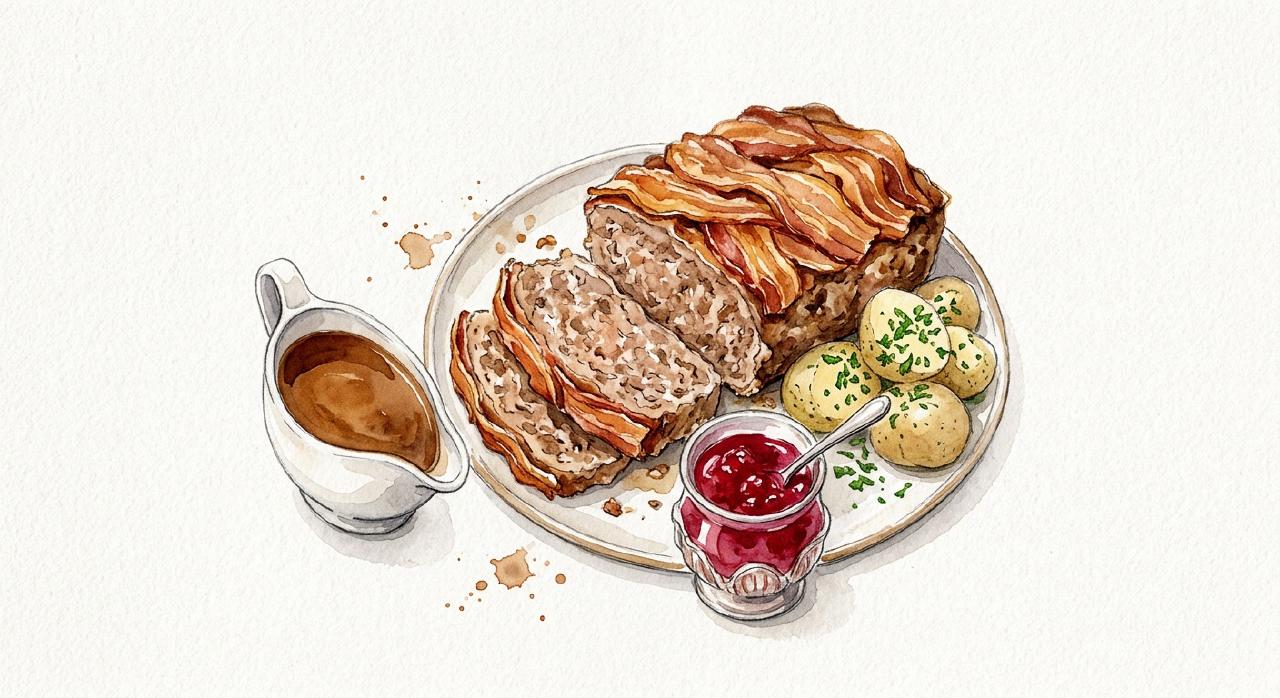 Forloren hare er det klassiske danske farsbrød med baconskiver over toppen — opkaldt efter sin form der minder om en hare på ryggen. Farsen er enkel: hakket svin og okse rørt med havregryn, æg og mælk, formet som et brød og bagt i to trin. Baconstrimlerne beskytter overfladen og tilfører smag. Sovsen laves af bagevæsken med fløde og en skefuld ribsgelé.