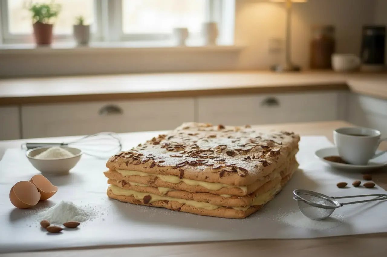 - Løsn bundene forsigtigt fra bagepapiret (de er skrøbelige). Læg bund → creme → bund → creme → bund → creme → topbund med nøddeflager.