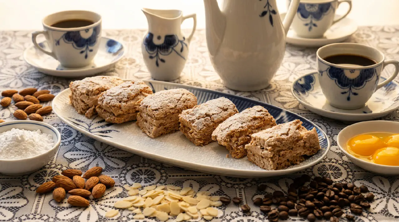 - Vend mandelmel og resten af sukkeret forsigtigt i marengsen. Fordel jævnt på de fire rektangler. Drys hasselnødeflager på én bund (toppen).
