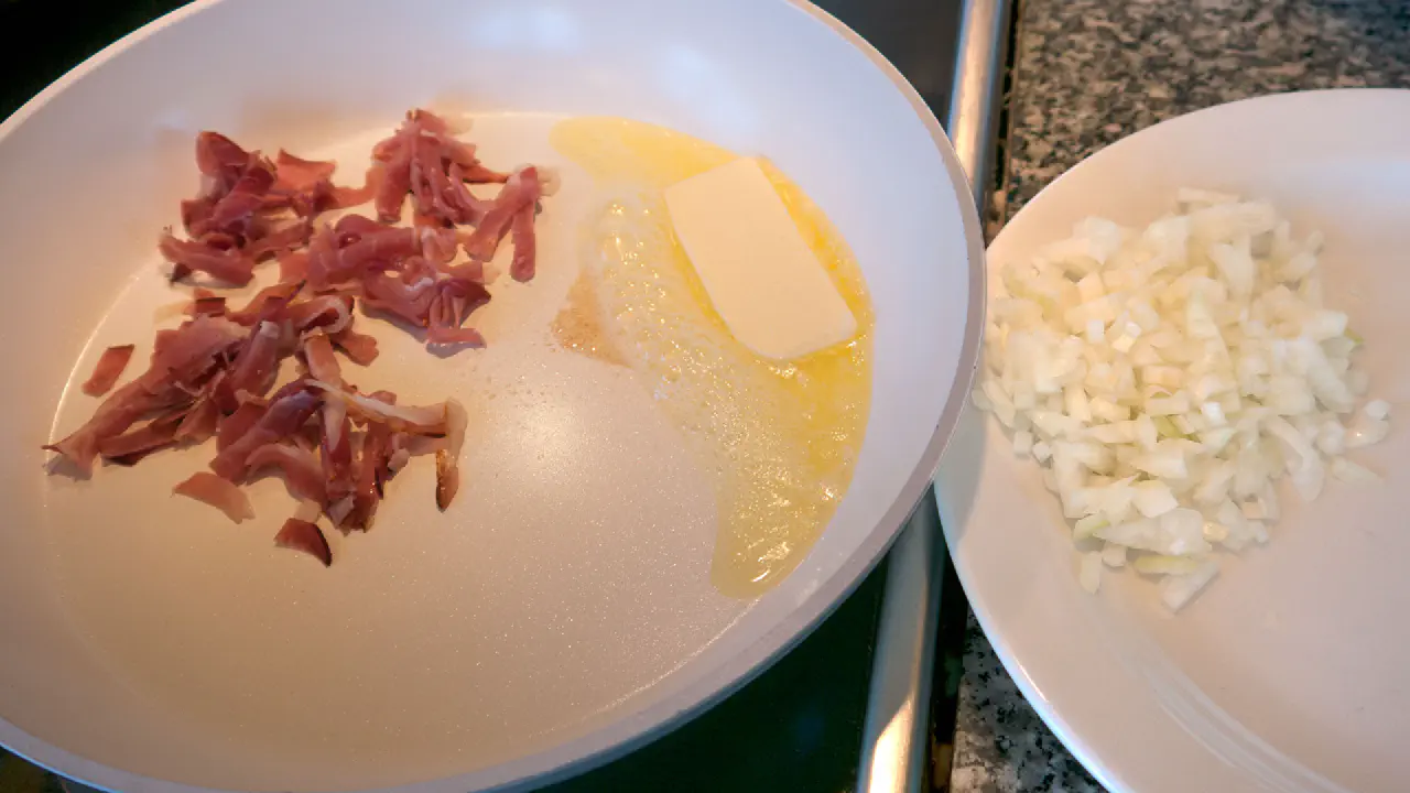 Bruger du tørret bacon, eller Schwarzwald skinke, som jeg gør på billederne, skal du kun bruge 100 gram. Og du skal bruge 50 gram smør, som jeg også gør på billederne.