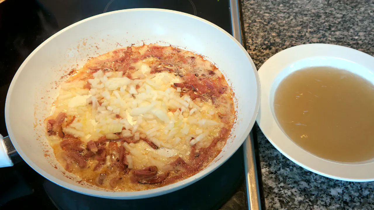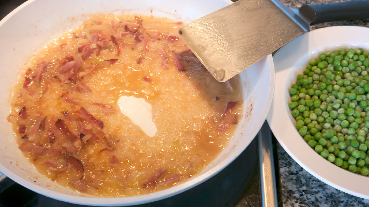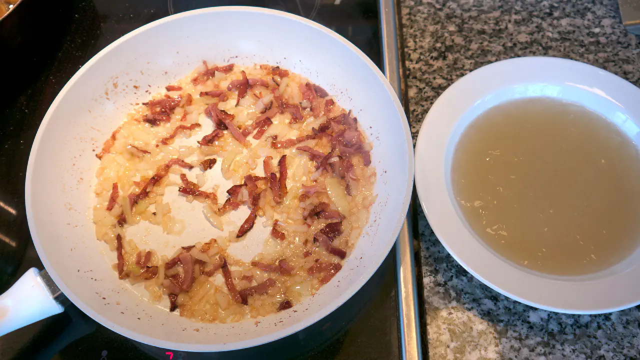 Når baconen begynder at blive sprød, så tilsæt løgene og steg dem gennemsigtige.