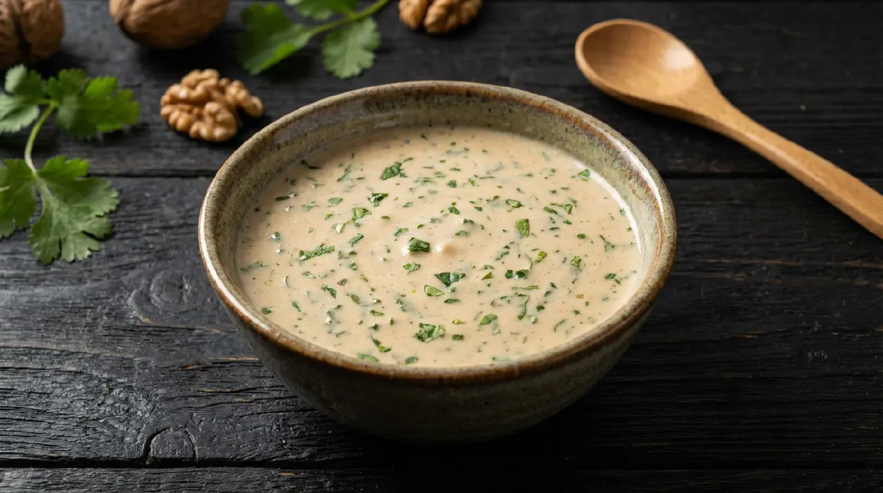- For en granatæblevariant (almindelig til fisk), erstat citronsaft og bouillon med 120 ml granatæblejuice og 120 ml vand. Tilsæt 2 spsk tomatpuré og 1 spsk hakket stærk peber. Sautér 2 hakkede løg i smør, før valnøddepastaen tilsættes. Udelad koriander, bukkehorn og gurkemeje.