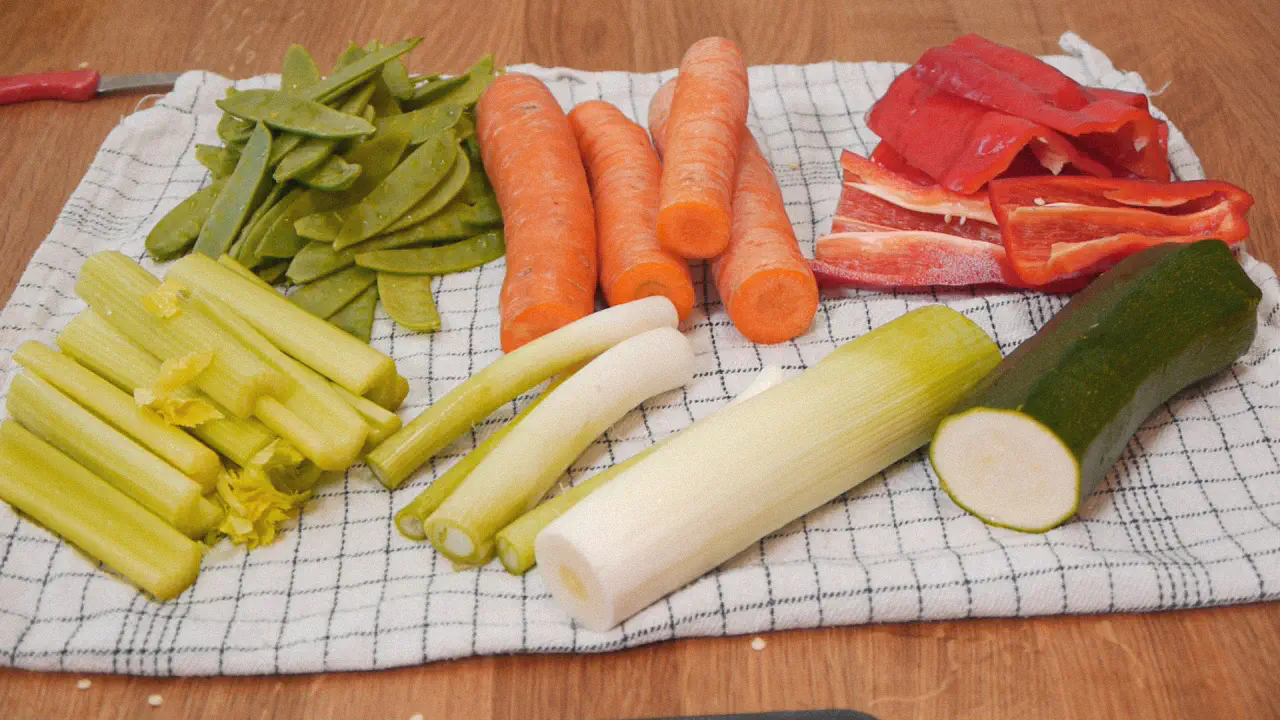 Skær alle grøntsagerne i lige store julienne. Dvs. tynde strimler på ca. 2-3 mm. Det har flere fordele.