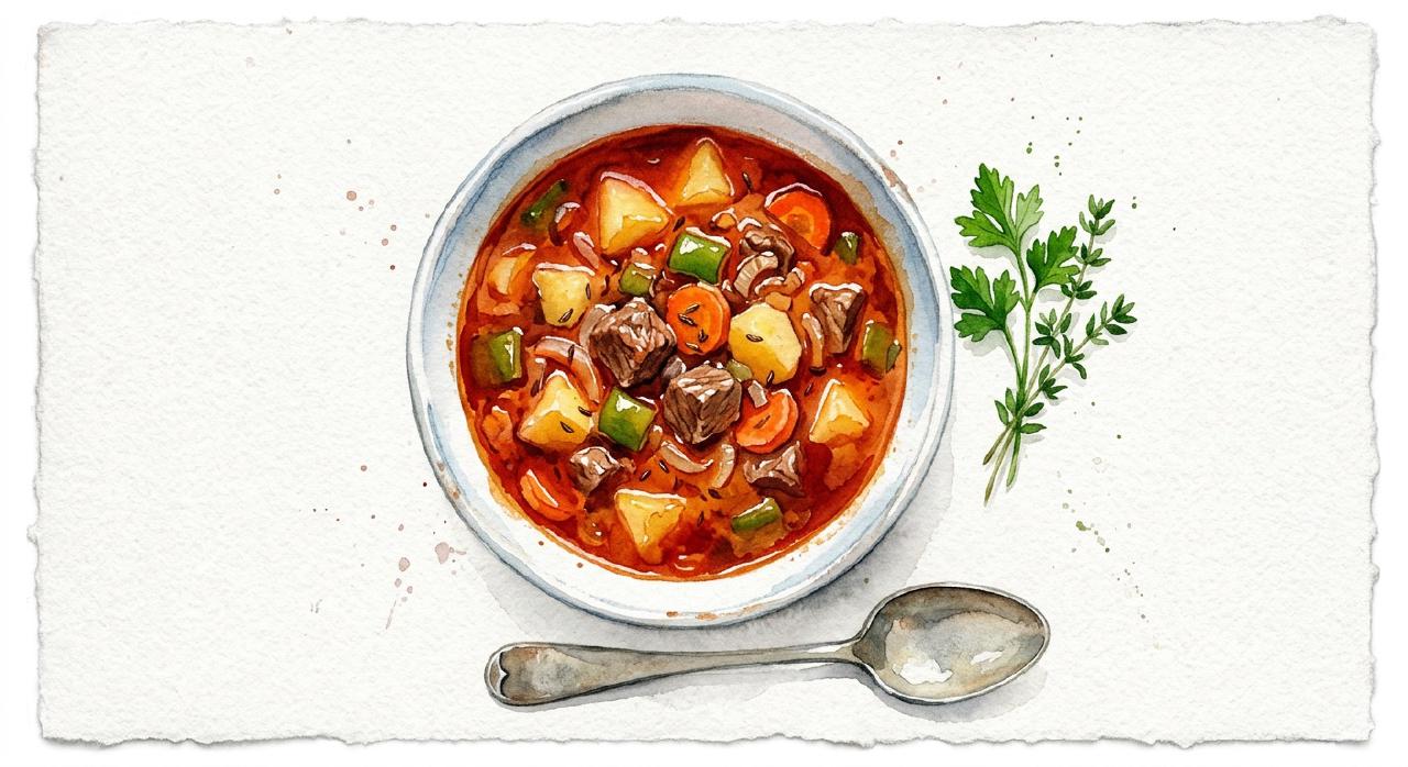 Gulyássuppe er en ungarsk-inspireret suppe der har fundet fast plads i det danske køkken. Den er mere suppe end gryderet — møre oksekødstern, kartoffelterninger og en ordentlig mængde sød paprika. Retten koger i to timer og klarer sig selv det meste af tiden.
