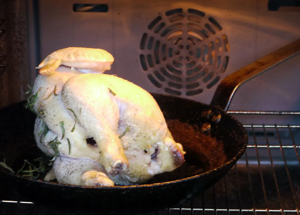 Du kan risikere at noget af skindet sidder fast i panden. Brug evt. en stor bred pallet kniv når du vender kyllingen så går der ikke så nemt hul på skindet.