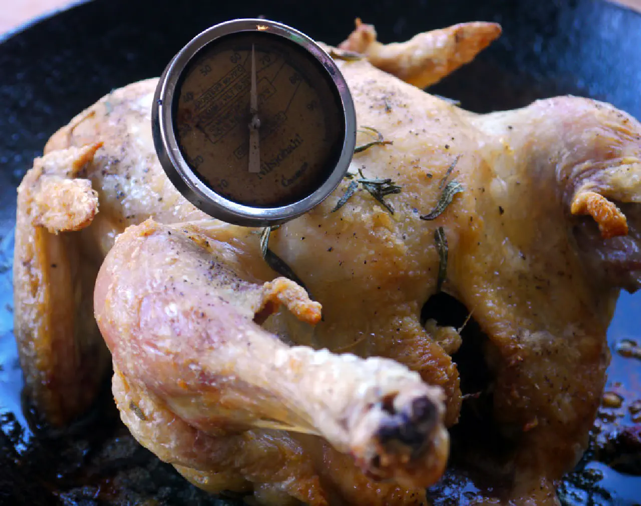 Kyllingebryst og kyllingelår er færdige ved forskellige temperaturer. Derfor skal lårene have mere varme end brystet. Fidusen her er at panden/fadet varmer lårene mere op end brystet. Det er derfor den helst skal være af metal. Keramik leder ikke varmen så godt.