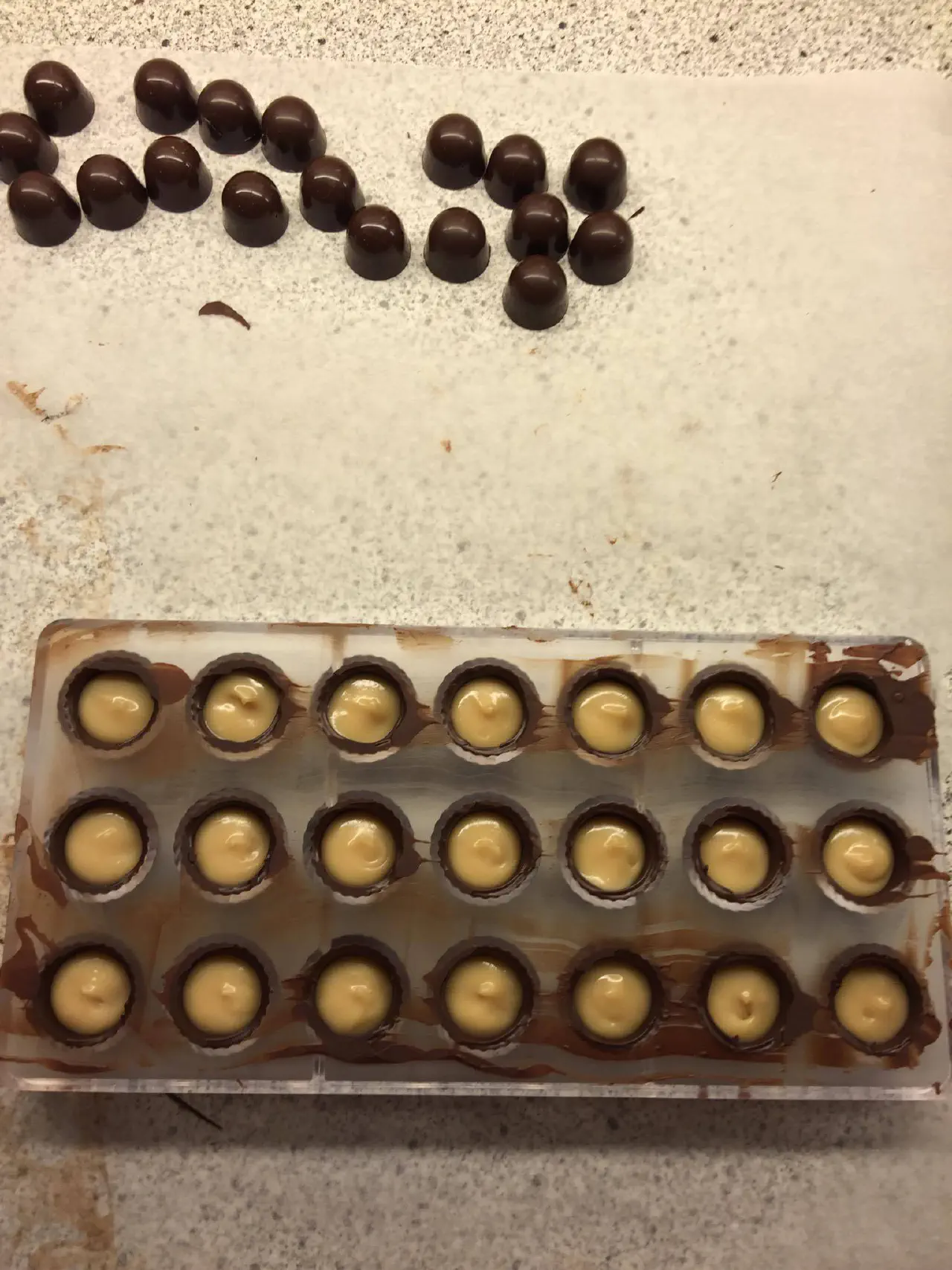 Når chokoladen i formen har sat sig, tages formen ud, og fyldet kan kommes i.