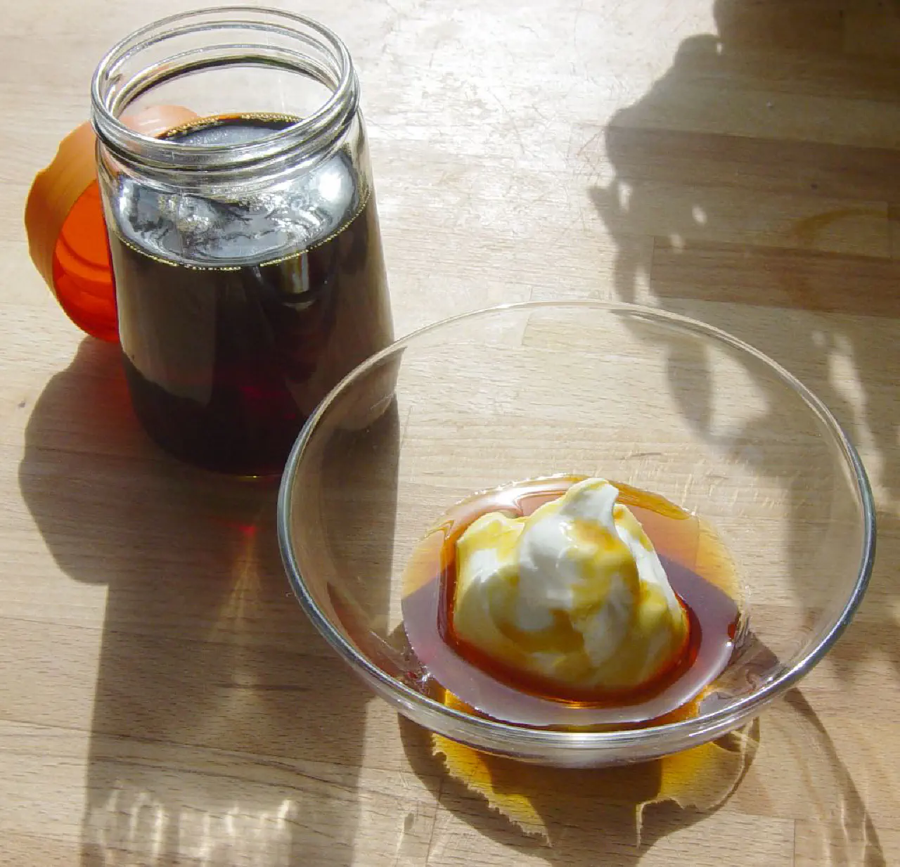 Det mest karakteristiske ved ahorn sirup er den gyldne farve, svagt karamelbrændte smag og et snert af lakrids. Det er det jeg forsøger at ramme. Det smager ikke helt som ahorn sirup, men det smager faktisk lige så godt.