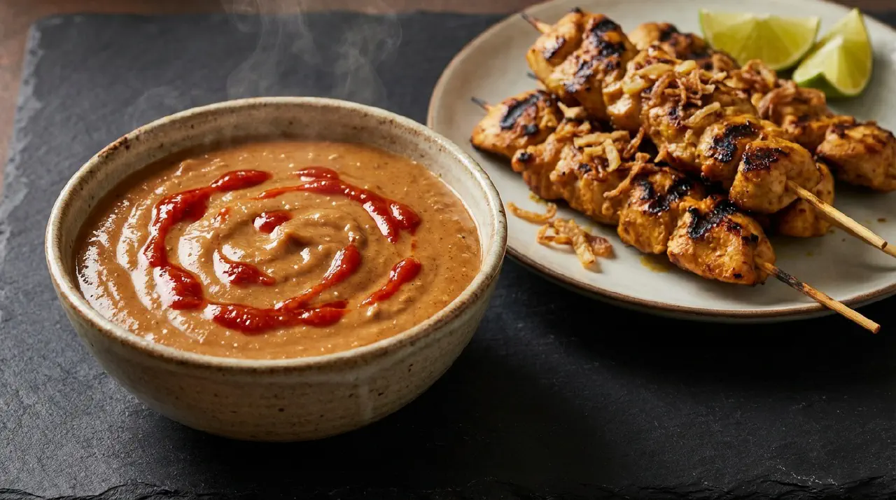 - For en mere aromatisk version (tættere på indonesisk sataysauce): Tilsæt 1 finthakket skalotteløg (~20 g), et 2 cm stykke galangal (skåret i skiver) og en stængel citrongræs bundet i knude i trin 2. Simr i 15-20 minutter i stedet for 10. Fjern galangal og citrongræs inden servering.
