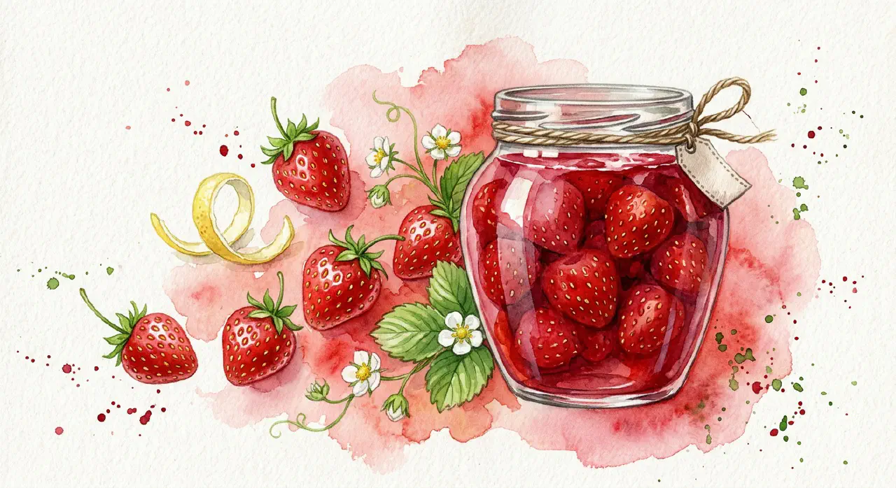 Jordbærsyltetøj lavet på syltejordbær giver et fastere og mere koncentreret resultat end de store spisesorter. Citronskal kogt med i lagen tilsætter en frisk bitterhed. Bærrene adskilles fra saften og koges hver for sig, så syltetøjet bevarer de hele bær i stedet for at blive til puré.