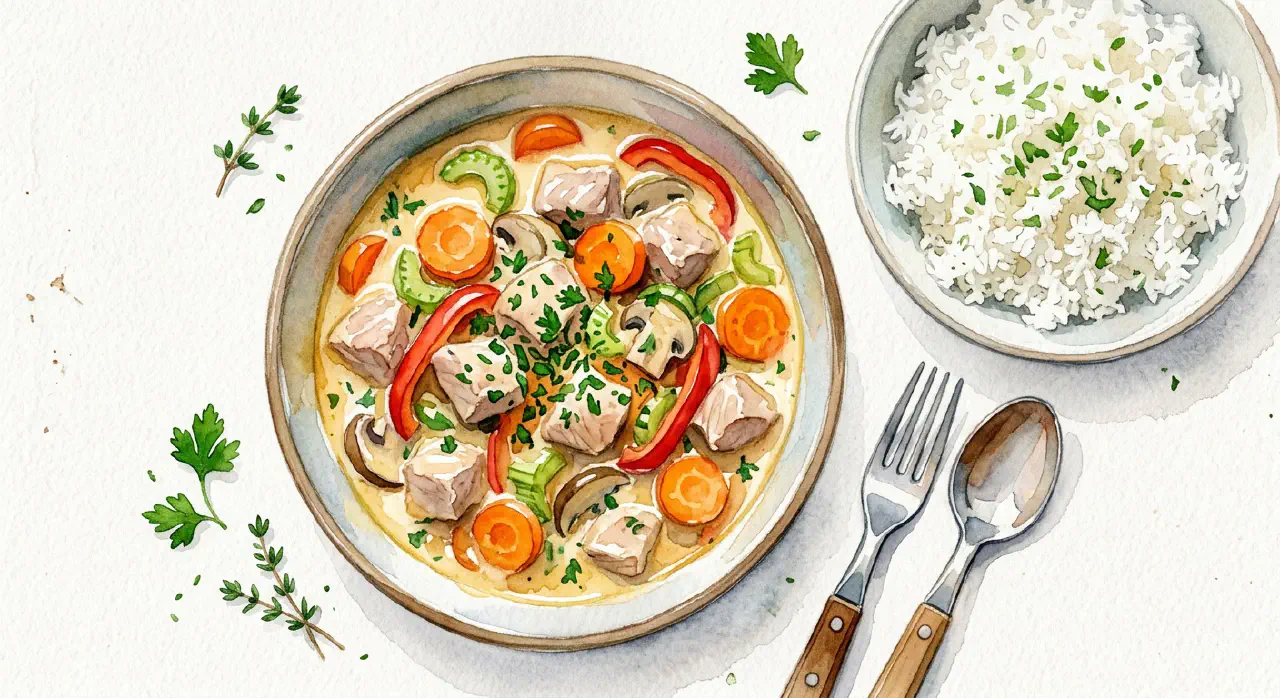 Kalvegryde er en französkt inspireret gryderet med kalvekød, grøntsager og hvidvin — braiseret langsomt til kødet er mørt og sovsen er fyldig. Røget spæk renderes i gryden først og giver en god smagsbund. Crème fraîche og citronskal røres i til sidst og løfter retten. Server med ris og salat.