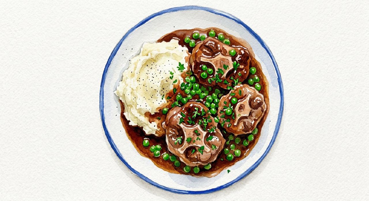 Kalvehaleragout er en tålmodighedsret — kødstykker der braises 3-4 timer til de er bløde som smør og falder fra benet. Halehalerne paneres i krydret mel inden bruning, og tomater og laurbær giver sovsen dybde. Ærter tilsættes i de sidste minutter for farve og friskhed. Det er mad der passer sig selv og smager bedst af alle.