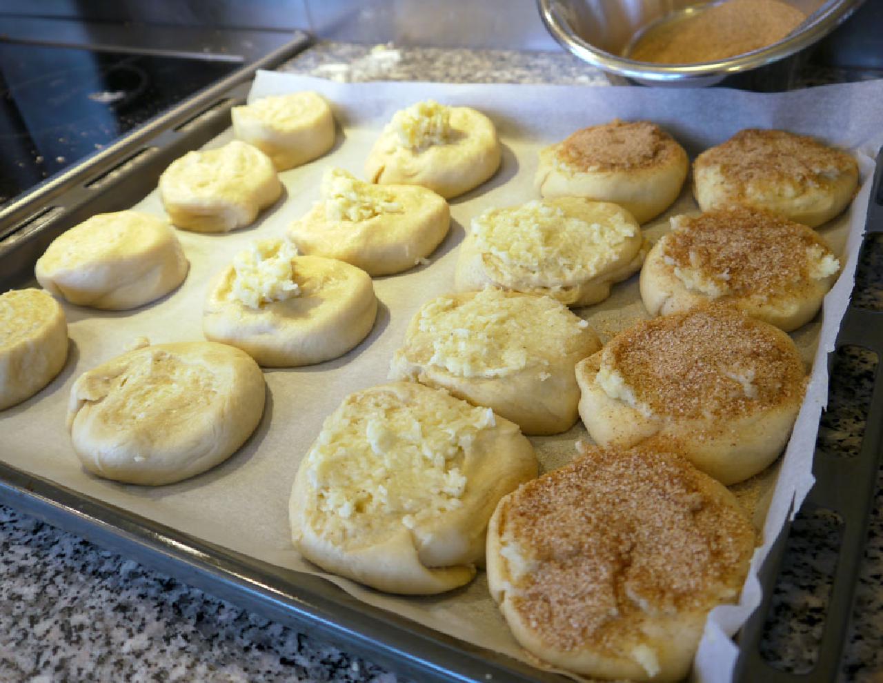 Det sidste fordeles så henover sneglene når rullerne er skåret ud i snegle, så der også kommer bagt creme på toppen.