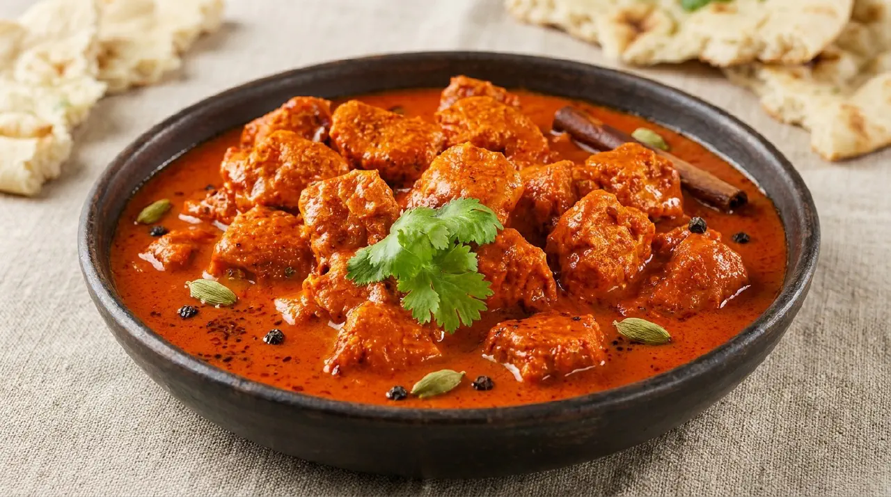 Retten læner sig på hele krydderier frem for pulverblandinger. Kardemomme og kanel giver en blid sødme, mens ingefær og hvidløg holder retten i balance. Chilipulver og paprika giver farve og en mild varme, ikke skarphed.