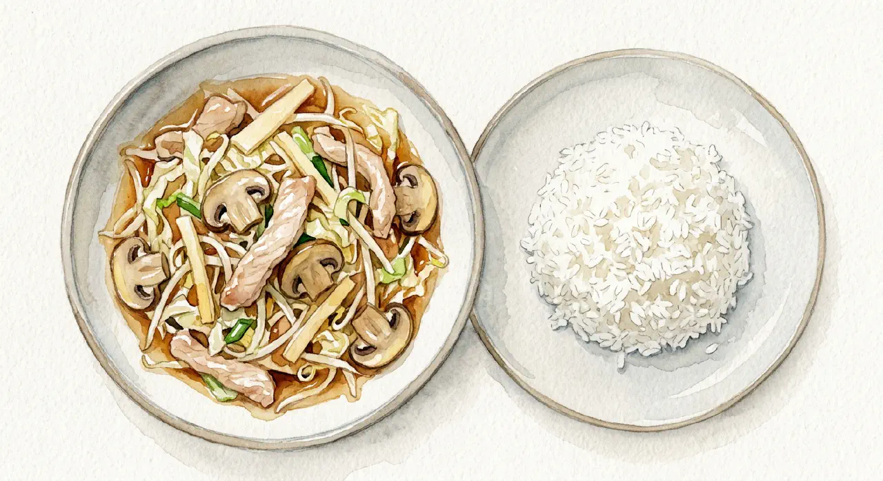 Chop suey er den danske 1970’er-fortolkning af kinesisk mad — svinekødsstrimler og grøntsager i en let sojabaseret sauce jævnet med maizena. Det er ikke autentisk kinesisk, men det er en dejlig hverdagsret med sprøde grøntsager og mørt kød. Bambusspirer og bønnespirer var eksotiske ingredienser dengang; i dag fås de i de fleste supermarkeder.