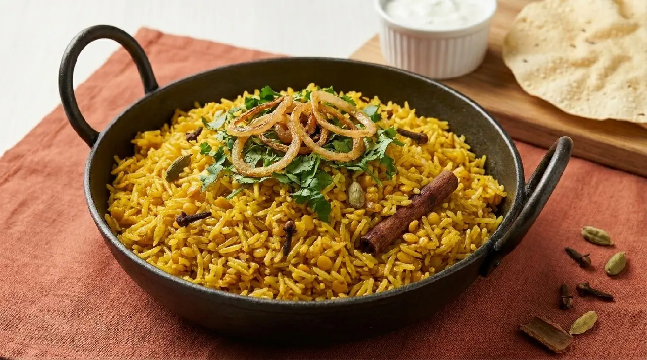 Den afgørende teknik er udblødning. En time i koldt vand før kogning betyder, at ris og linser bliver færdige samtidig og får den rigtige, lidt grødede konsistens. Serveres med sprødstegte løgringe og frisk koriander på toppen.