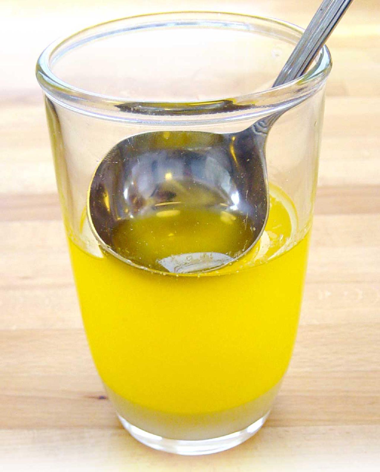 Klaret smør. Lidt protein flyder øverst. Det klarede fedt i midten, og mælkeprotein, vand og salt i bunden. © kvalimad.dk
