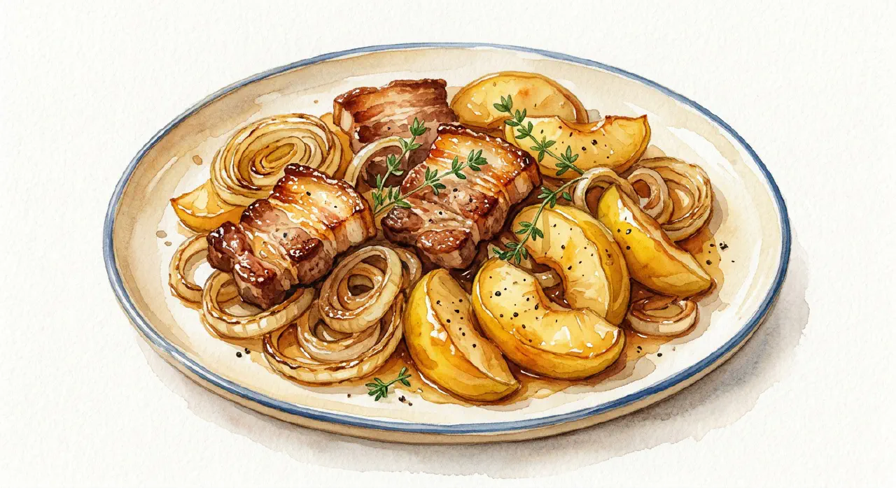 Klassisk æbleflæsk — stegt flæsk med æbler og løg, anrettet side om side på et varmt fad. Serveres med groft rugbrød og sennep. Simpel, solid hverdagsmad.