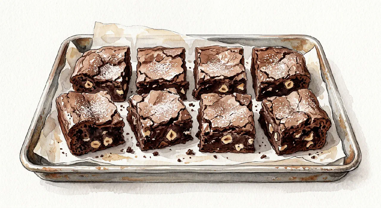 Klassiske brownies med kakao og hasselnødder — seje indeni og sprøde udenpå. Bages i ét fad og skæres i firkanter. Hurtige og nemme.