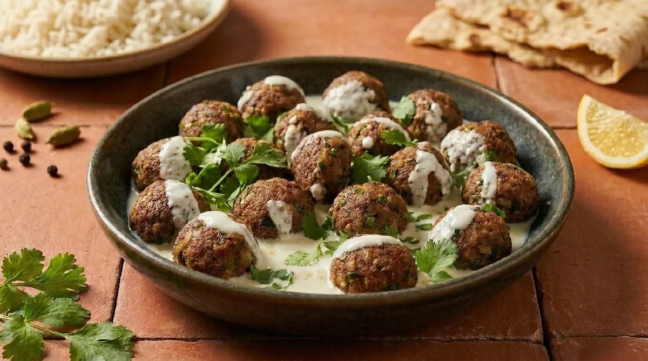 Retten hører til i det nordindiske køkken, hvor varme kødboller og kold yoghurt er en klassisk kombination. Kontrasten mellem den sprøde, krydrede stegeflade og den kølige, syrlige yoghurt er hele pointen. Bollerne må ikke ligge for længe i yoghurten før servering, ellers bliver de bløde og mister teksturen.