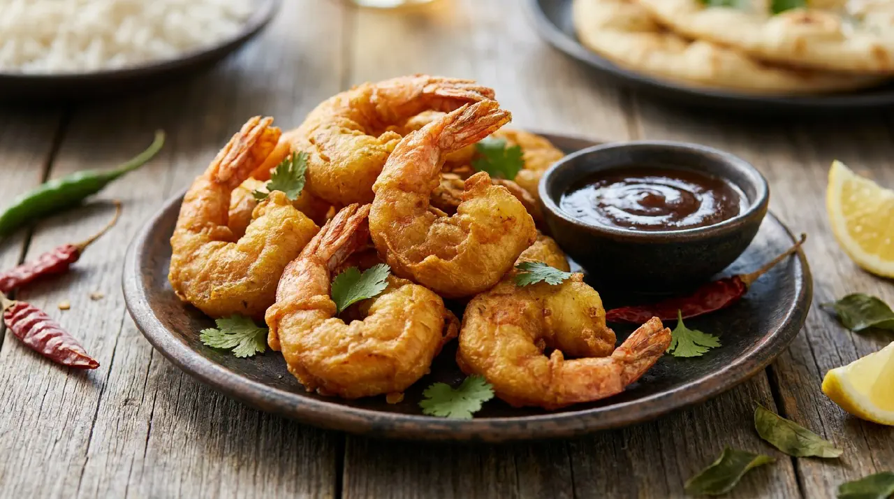 Retten bruger kogte rejer, ikke rå, så stegningen handler om at give dejen farve og ikke om at tilberede rejerne. Det går hurtigt — et par minutter pr. hold i varm olie. Server dem mens de stadig knaser.