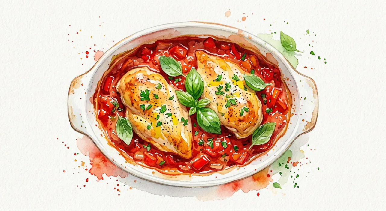 Kyllingebryst lagt i et ildfast fad, dækket med en frisk tomatsauce med peberfrugt, hvidløg og basilikum, og bagt i ovnen til kødet er gennemstegt og saftigt. Det er en af de hurtigste og nemmeste ovnretter — nærmest ingen forberedelse, og ovnen gør resten.