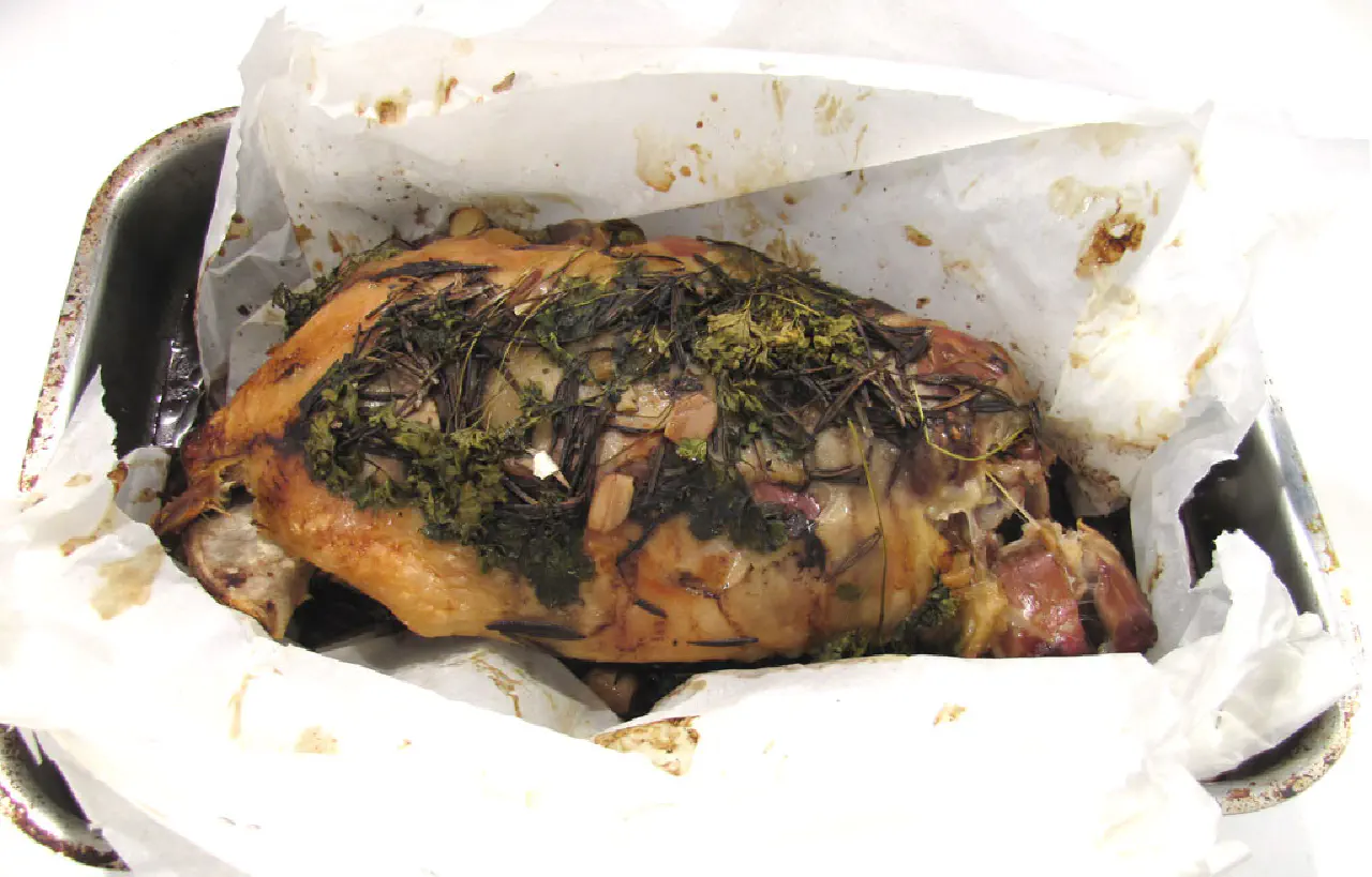 Hvis du ikke har en tæt gryde eller stegeso som lammekøllen kan være i, så skær to stykker bagepapir der kan gå hele veje rundt om køllen på henholdsvis den korte og lange led.