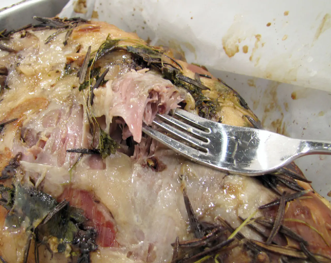 Det blev sat i ovnen om aftenen og stod natten over. Da det var færdigt blev det skilt fra benet med en gaffel, og lagt i et fad sammen med safterne i bunden af bradepanden. Så var det klart til at blive varmet op om aftenen da det skulle spises.