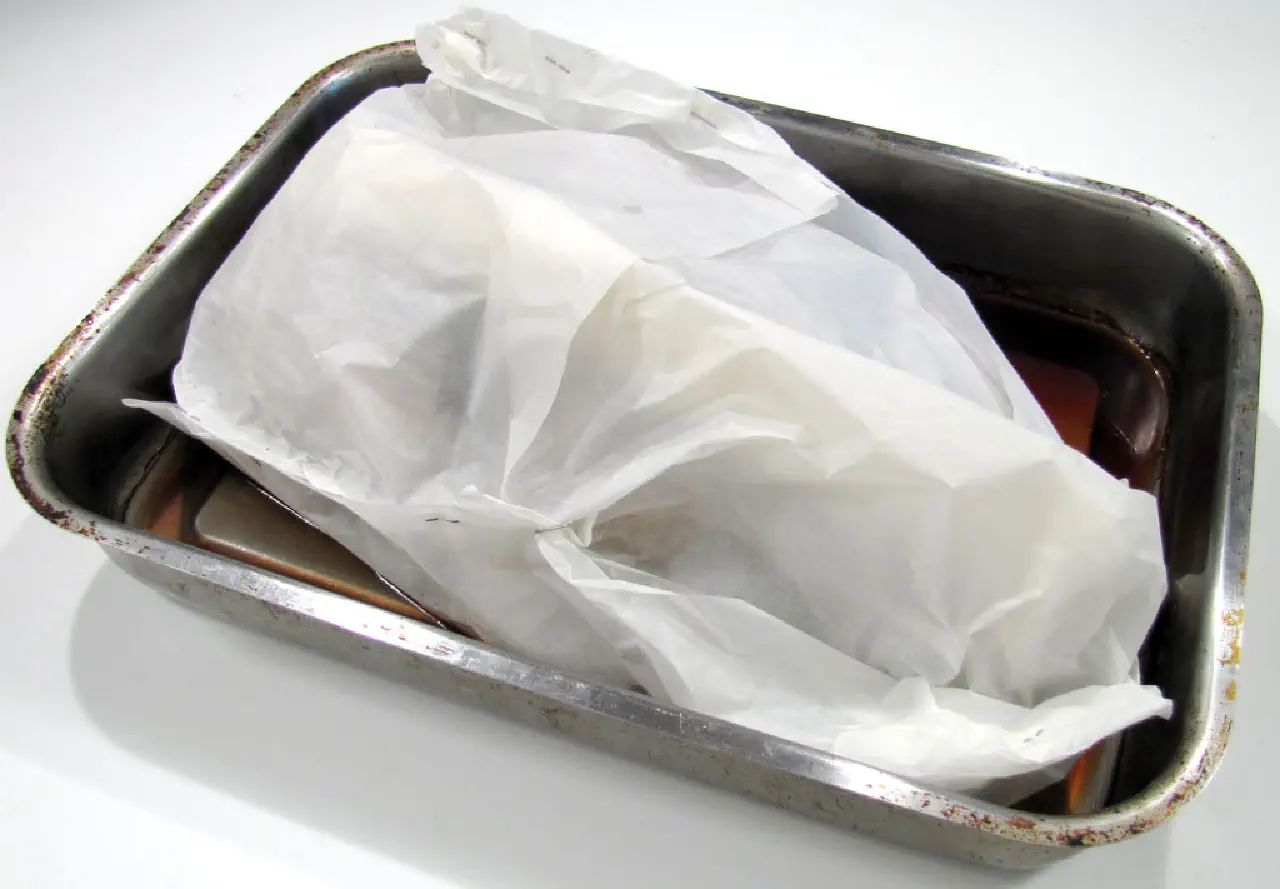 Fold bagepapiret sammen om lammet så det er en så luftæt pakke som muligt.