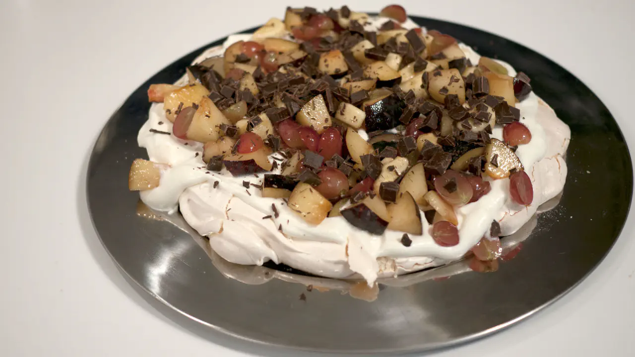 Kagen kan lyde vammel med marengs og flødeskum, men den er forbavsende afbalanceret pga. Syren i frugterne og bitterheden i den mørke chokolade.
