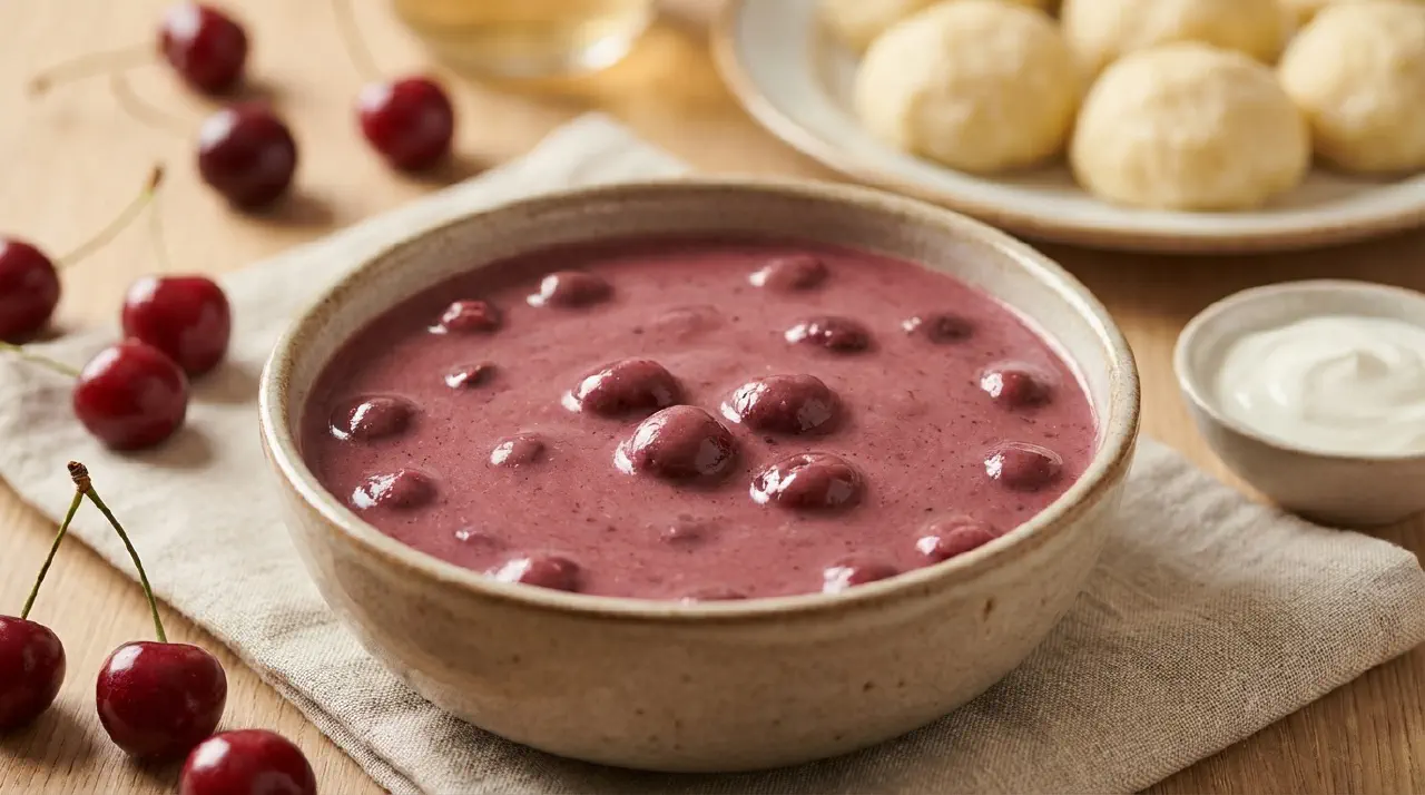 - Creme fraiche (tejfol) er det traditionelle valg og giver en let syrlighed, der komplementerer kirsebærrene. Madlavningsfløde kan bruges for et mildere resultat.