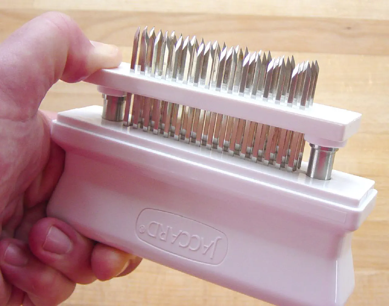 Det er godt nok endnu et af mit mere “eksotiske” stykker køkkenværktøj. Men jeg er glad for min Jaccard. Et håndtag med 42 små skarpe og sylespidse knive. Der sidder så en hullet blok som med fjedre får knivene ud af kødet igen.