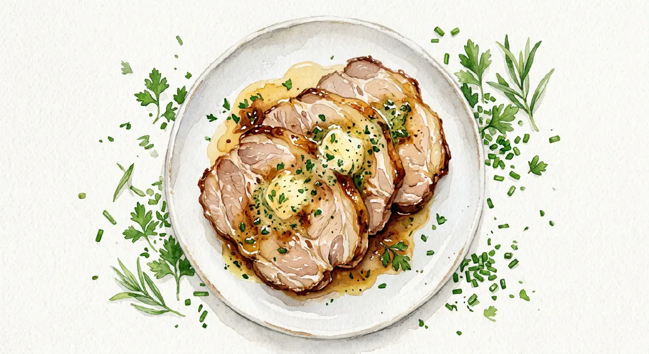Fjern film eller folie og lad kraften løbe ud. Skær stegen i tynde skiver og øs lidt stegekraft over. Server det resterende kryddersmør til — det er oplagt til de bagte kartofler.