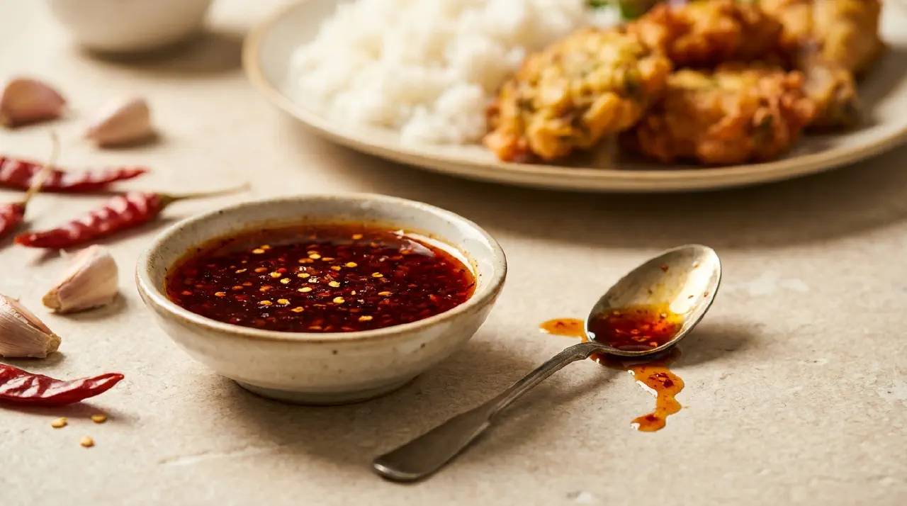 En burmesisk syrlig-sød chilisauce lavet af tørrede røde chilier, hvidløg, fiskesauce og riseddike. Det er et forrådskammerkrydderi, ikke noget der laves frisk til hvert måltid – blend det én gang, og det holder i ugevis i køleskabet. Saucen virker tynd, når den først er lavet, men den tykner, efterhånden som chilipartiklerne absorberer væske. Lad den hvile mindst 24 timer, før den bruges.