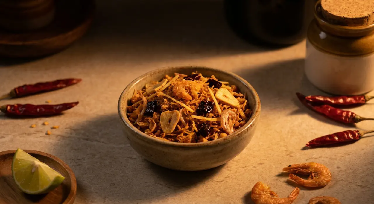 Overfør rejeblandingen til en stor skål. Lad det hele køle helt af. Tilsæt de stegte skalotteløg, hvidløg, ingefær, knuste chilier og salt. Vend forsigtigt. Smag til – rejepasta bidrager allerede med en del salt.