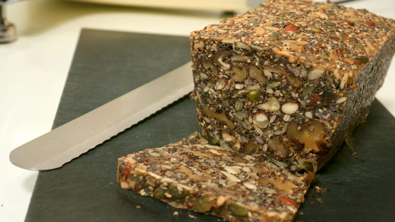 Opskrift med video - Puha … nødder er dyre. Men dette brød er alligevel, på kort tid, blevet en af mine favorit opskrifter. Et brød der er lavet af nødder, kerner, frø, æg og olie. Alle kan lide det. Det er specielt godt til ost, charcuterie, postejer osv. Men det er også godt med “almindeligt” pålæg. Eller som en snack hvis man skærer det i tynde skiver og rister det på en pande med lidt smør.
